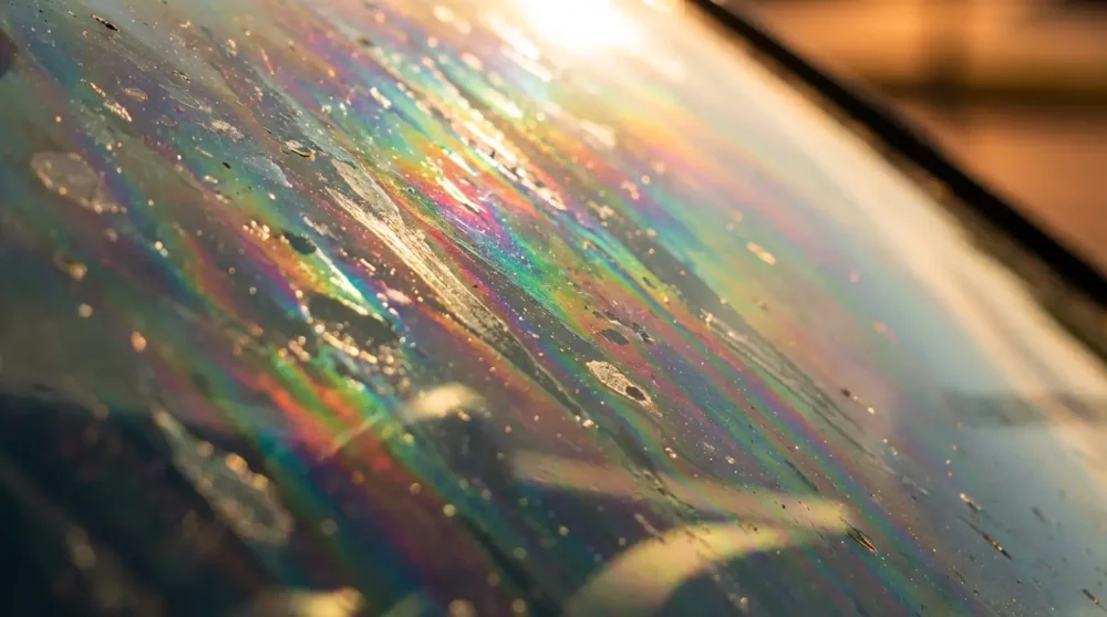 %[Close-up of oily rainbow film on car windshield