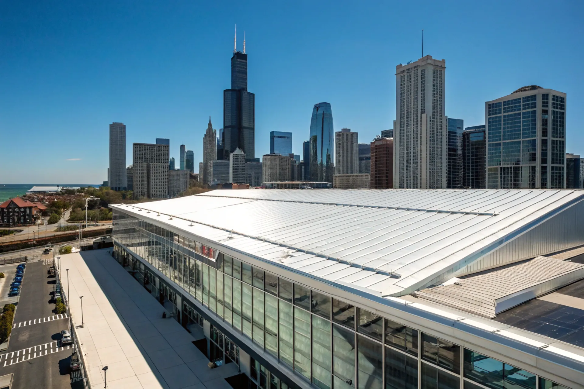 A sleek modern building with a shimmering white roof under bright sunlight, reflecting heat waves into a clear blue sky, with a cityscape in the background